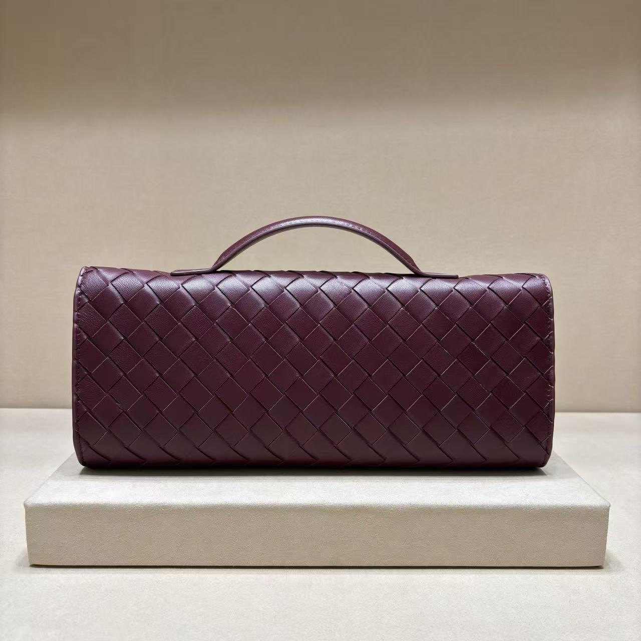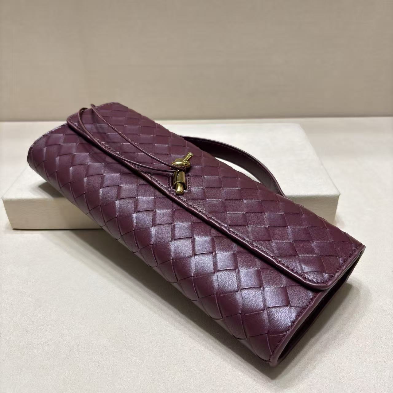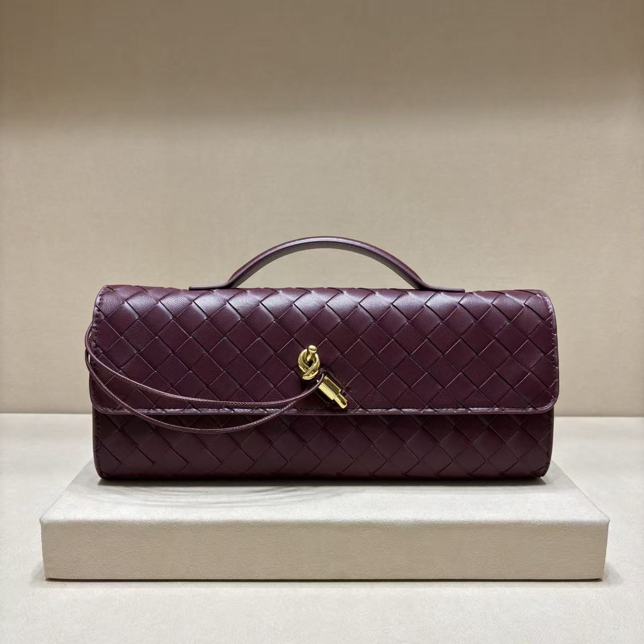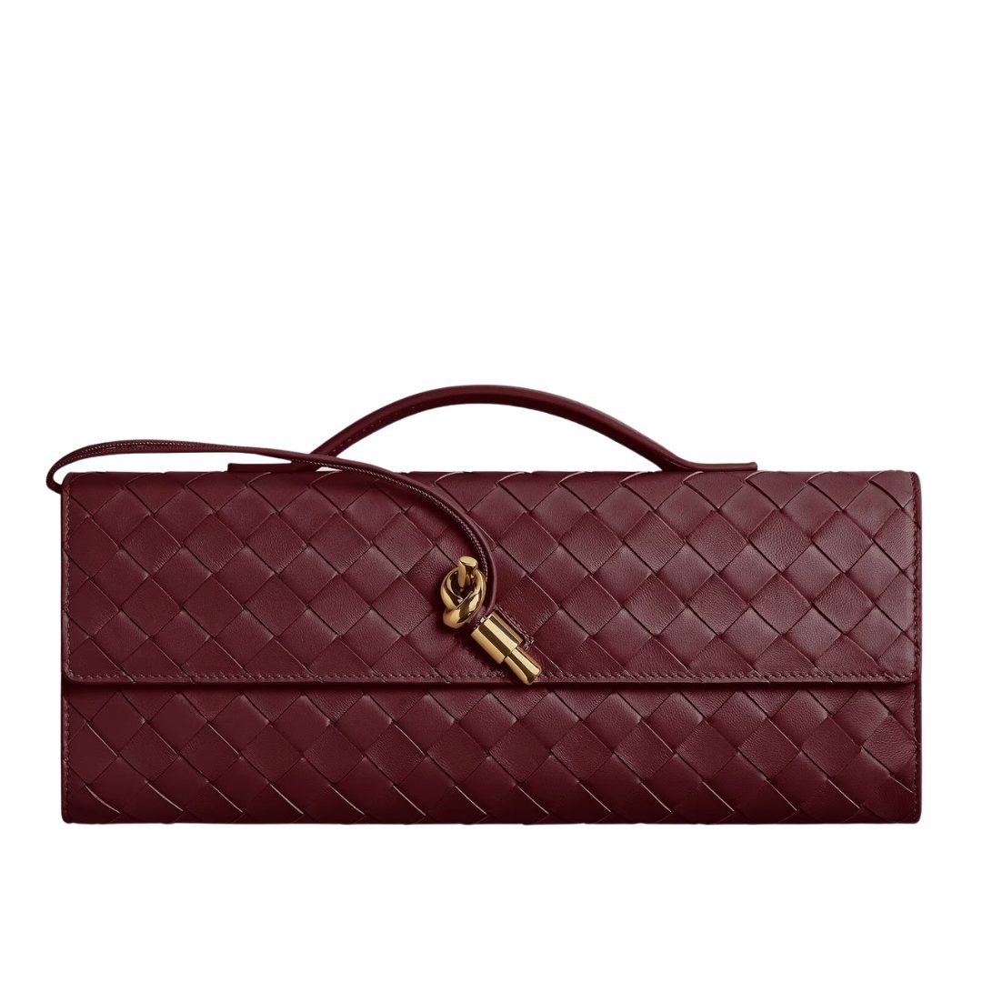 Top handle clutch in supple Intrecciato leather with signature knot closure.